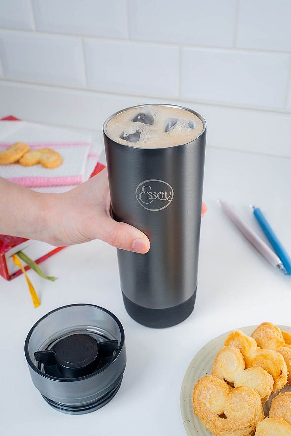 Su tapa 360° permite beber desde cualquier ángulo, mientras que el sistema antiderrames y la base de silicona antideslizante la vuelven ideal para llevar a la oficina, al colegio o de paseo.